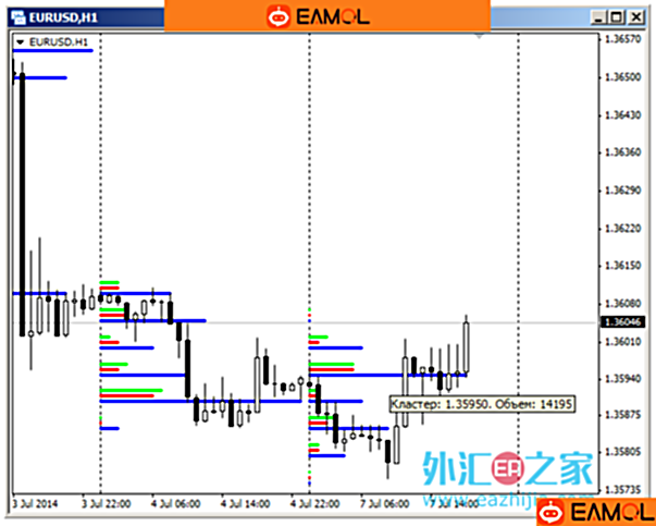 ClusterBox DayHistogramm – horizontal cross-section of the market by days Forex Indicator provides for an opportunity to detect various peculiarities and patterns in price dynamics which are invisible to the naked eye.