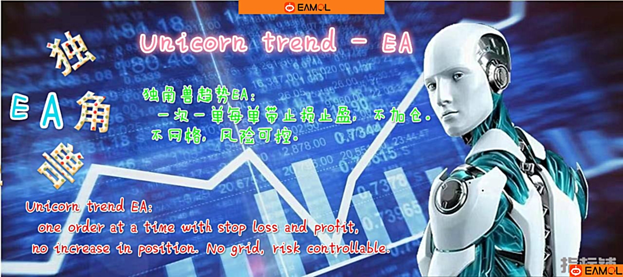 独角兽趋势EA,是一款纯趋势EA,策略主要是根据均线来判断趋势,本策略一次一单,不加仓不网格,每单带止损止盈。