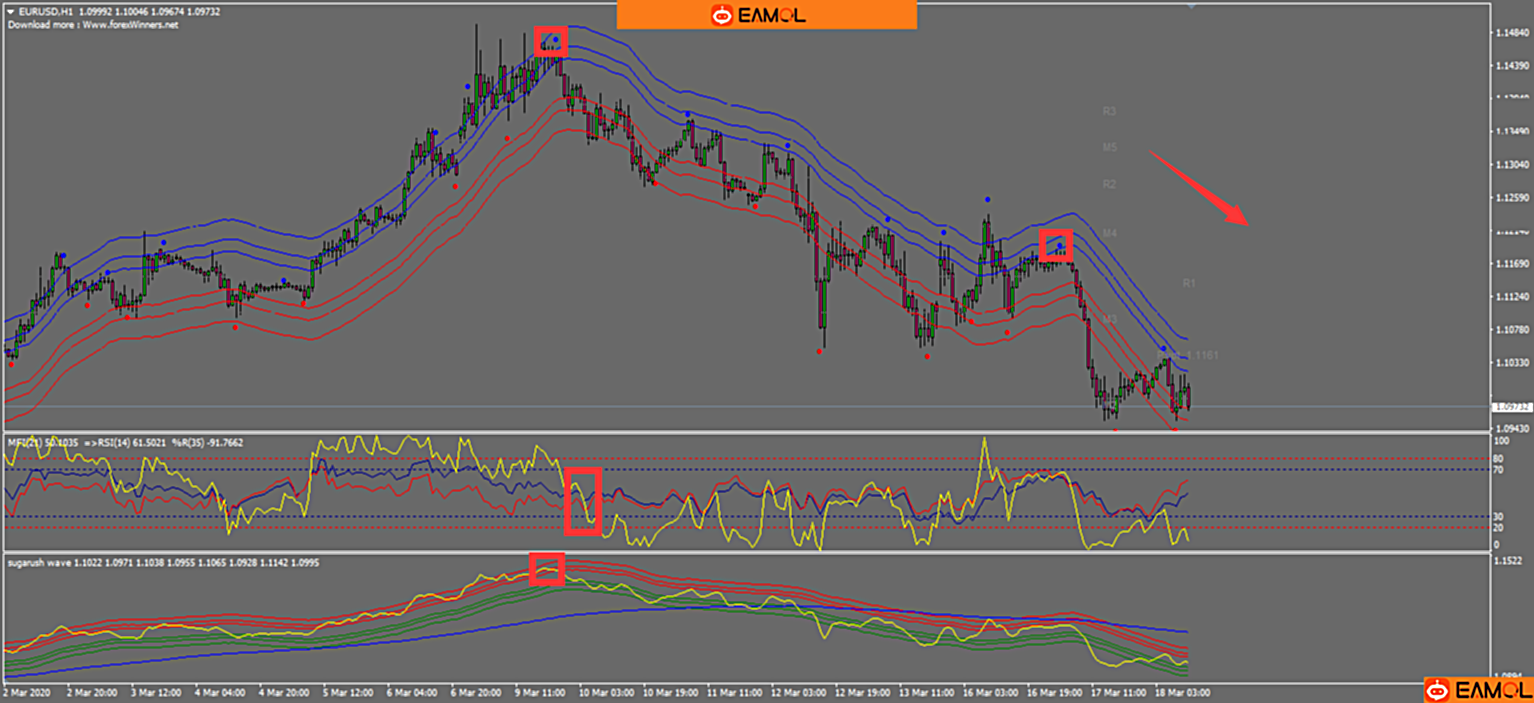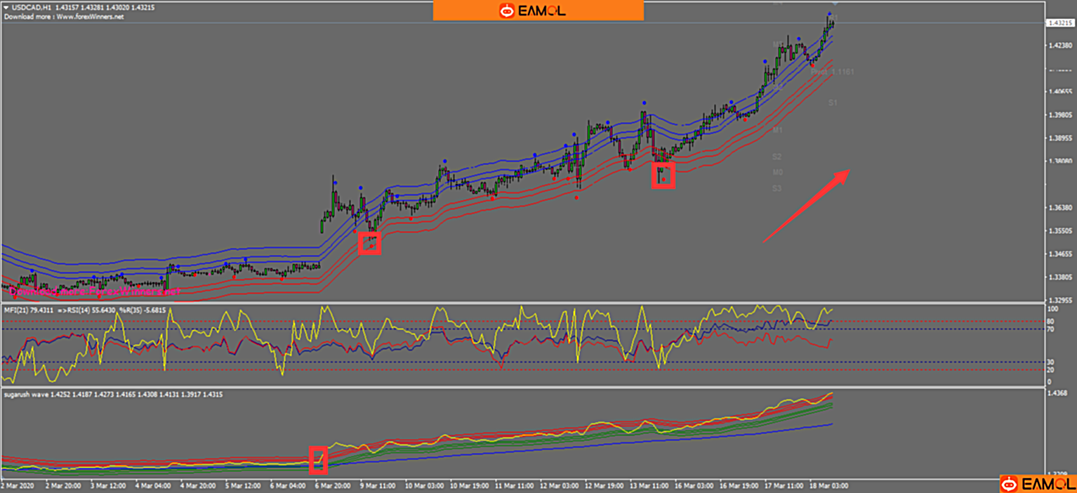 Abid Method外汇交易系统策略:A. 交易规则1. 做多时机:MFI指标的黄线上穿红线和蓝线,sugarush wave指标的黄线上穿红线和绿线且在蓝线上方,价格在lower envelope指标红线上方且有红点提示买进。2. 做空时机:MFI指标的黄线下穿红线和蓝线,sugarush wave指标的黄线下穿红线和绿线且在蓝线下方,价格在lower envelope指标蓝线下方且有蓝点提示卖出。