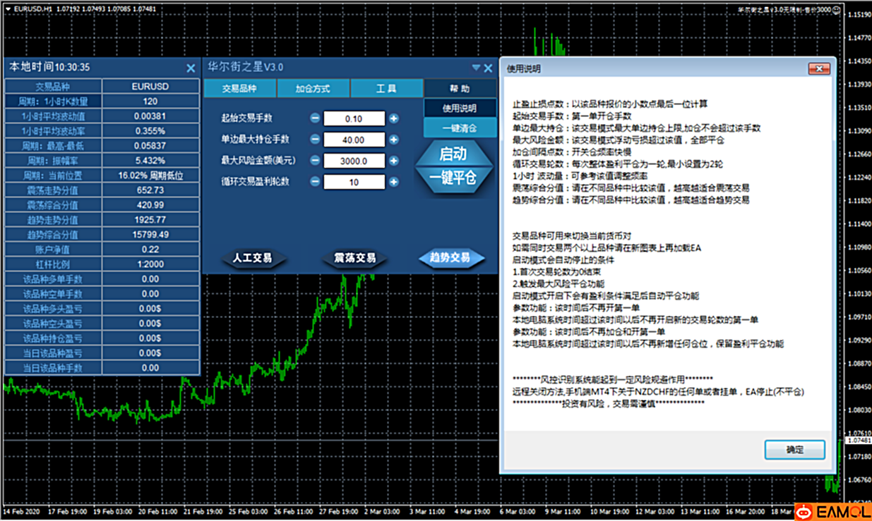 该EA策略拥有三大交易系统:震荡交易、趋势交易、人工辅助交易。 四大辅助系统:切换交易品种、四大加仓方式、实时数据工具,壹键清仓。