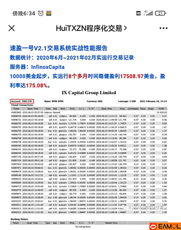 结合人工智能技术,根据量化大数据、数学概率算法开发,此EA为激进型高收益有追单功能的EA(风险适中,带总止损), 通过概率优化,将“高风险”转化为”低风险”的成功模型。设计理念为每一轮下单都要盈利,运行时达到条件首单会智能即时下单,首单获利时在确保盈利的情况下智能复式加仓追综盈利平仓,让盈利奔跑使得收益最大化;首单反向浮亏时按设定的条件追单,整体获利时智能总平。运行时系统可智能自动选方向或手动选方向下单,带总止损、带超点差及资金风险率仓位管理风控。首笔下单量、追仓频率、倍率、总止损均可根据自身的风险喜好及风控水平自主调整设定,足够资金小仓位操作能做到稳盈利。量化