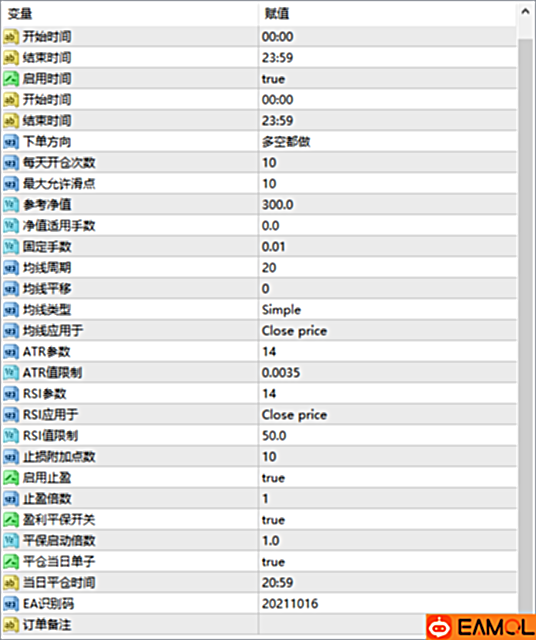 参数大家可以研究下,搞了一天参数没有配置好,有没有高手研究下弄个好的参数 时间为平台时间, 有平保,止损时ATR值 附加点数时可以自己加的 其他的没什么