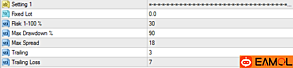 固定手數==>固定手數的未結訂單(0.0開啟指數增長)風險百分比%==>指數增長的風險百分比最大跌幅%==> EA停止運作前的跌幅最大點差==>最大點差過濾器,2 = 20點= 2點
