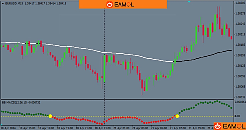 蜡烛是绿色的,价格栏收盘高于均线和BB MACD指标产生黄点( +绿点)