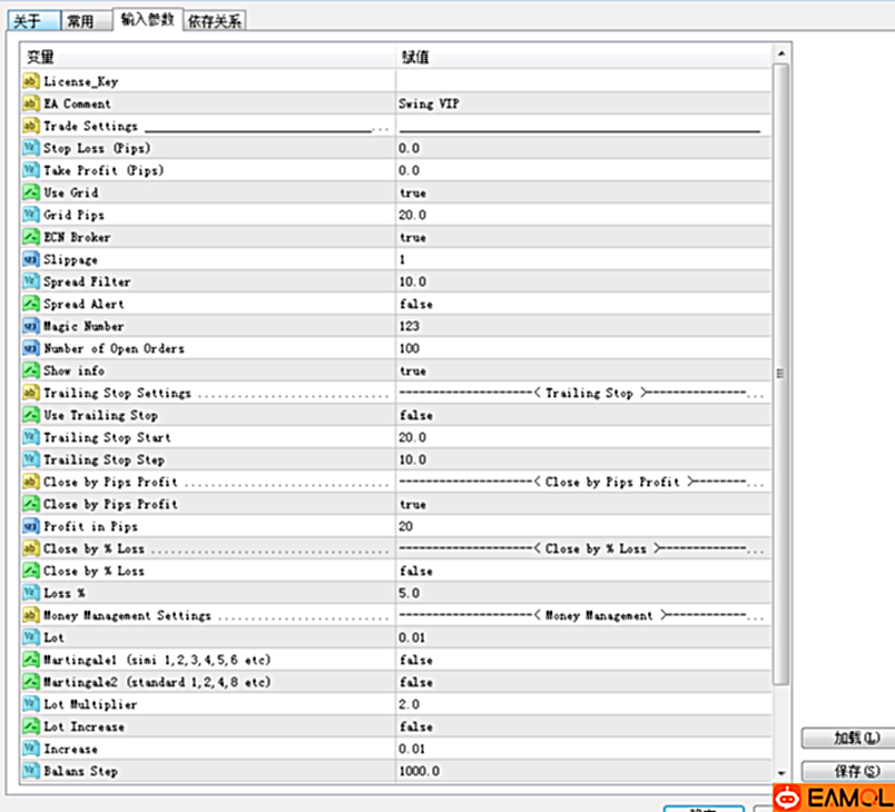 Swing VIP EA由国外团队SinryAdvice开发,该ea基于裸K技术、趋势、CCI等指标(没有马丁策略)也可以选择开加仓模拟。运行货币对:AUDCAD, CADCHF, EURUSD, NZDCAD, USDCAD时间周期:M5