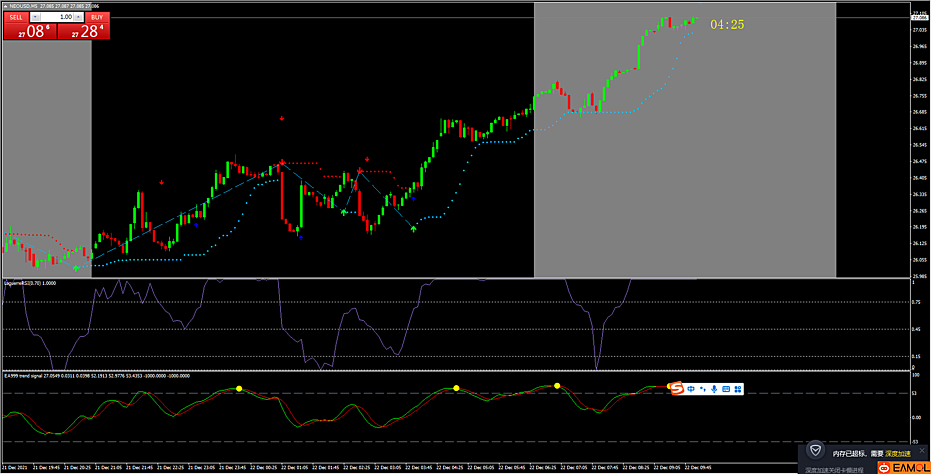 简短输入:BuySell红色箭头由以下方向确认:方向绿色箭头,FDM绿色和Laguerre RSI> 40。