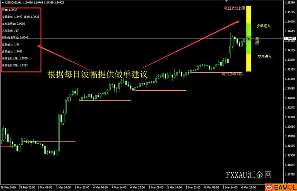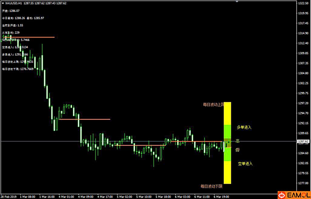 K线每日波幅做单参考指标的运行原理是根据最近历史K线波动幅度推算出当天可能波动的幅度上限和幅度下线,然后自动计算出整理区间,突破整理区间顺势交易的原理,达到每日波动幅度上下限位置平仓。