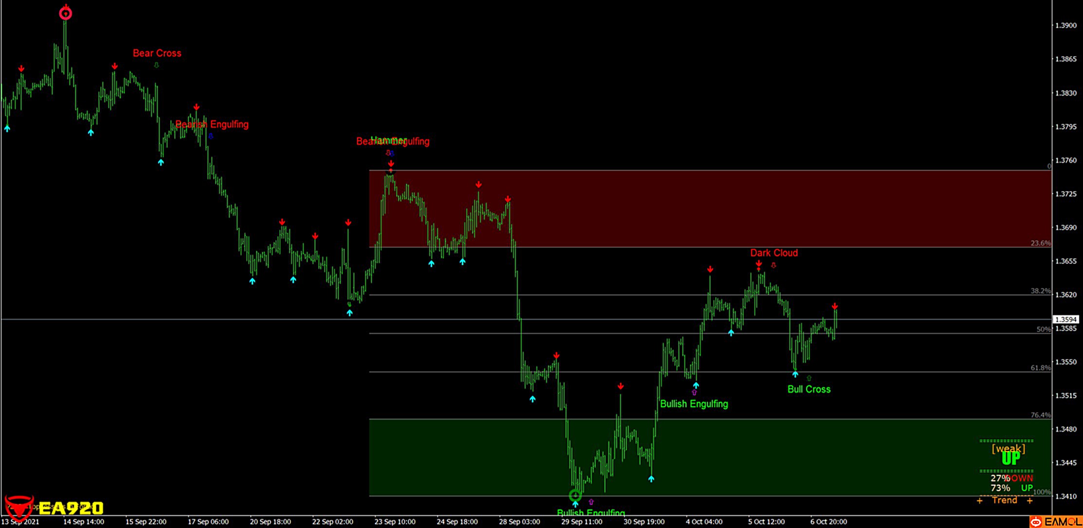 短线交易,等待出现蓝色和红色箭头出现就可以下单了。长线交易,等待有绿色和红色圆圈的箭头出现再下单。
