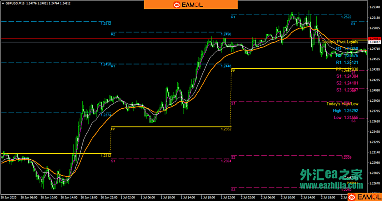 2、图表中的粉色线、白色线和黄金色线必须在枢轴线的上方