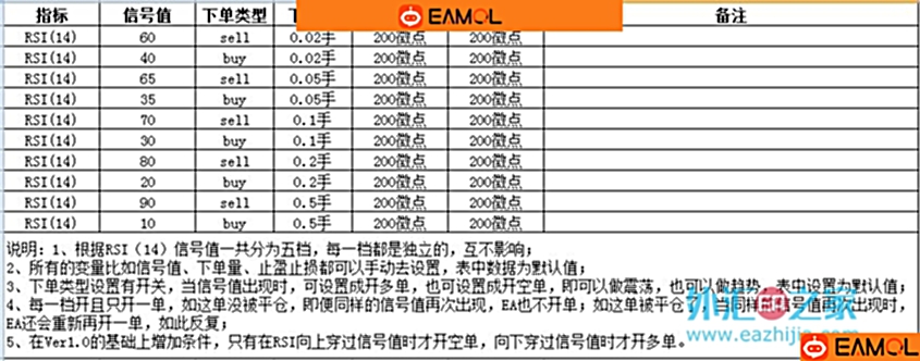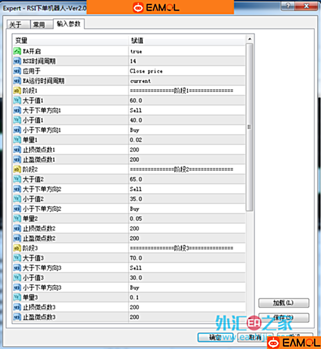 这款EA(RSI下单机器人-Ver2.0)可以说是根据RSI(14)指标值设计的一款功能强大的下单机器人,在RSI指标的每一个关键值上都有下单开关,根据投资者的投资习惯,可以做震荡,也可以做趋势,开单方向、下单量、止盈止损都可以手动去设置,也可以采用默认值(200微点)。