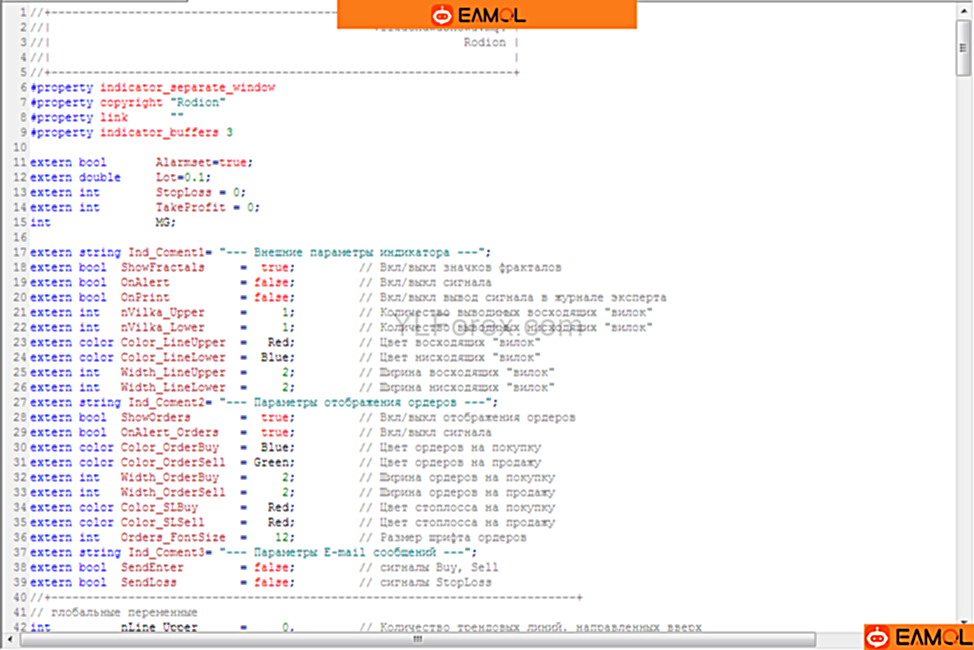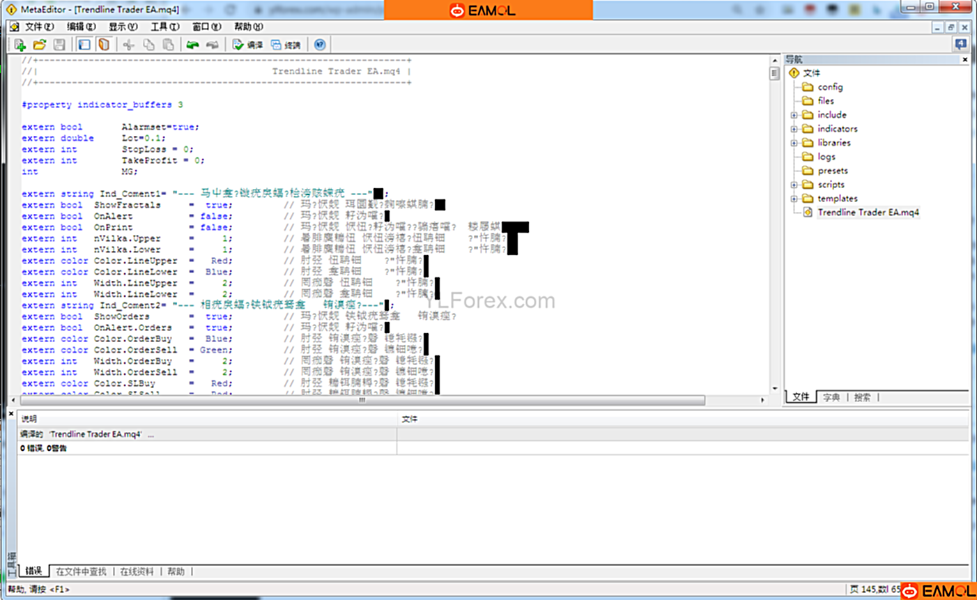 Trendline Trader EA是俄罗斯的国际友人编写的,是2015年的时候收集到的资源,当时咱们电脑上安装的中文版MT4编译器还不能识别俄文,所有涉及到俄语的文字,在MT4的编辑器中体现的都是乱码,就是下面这样的
