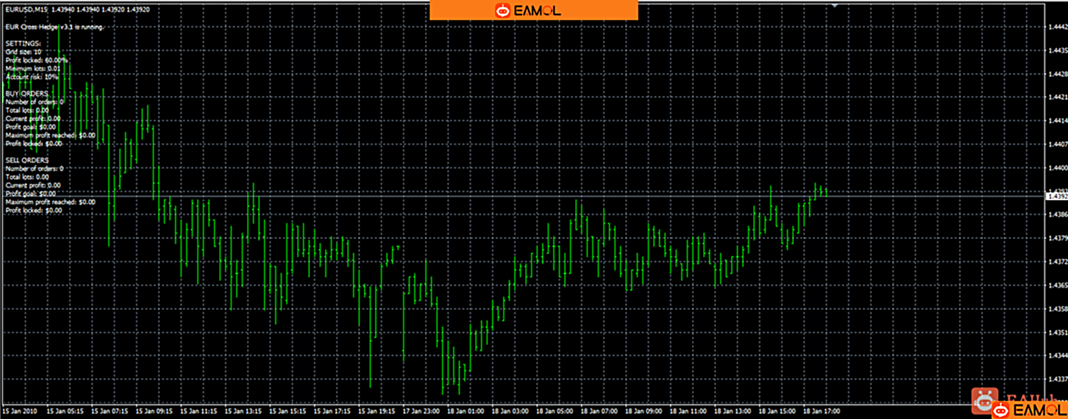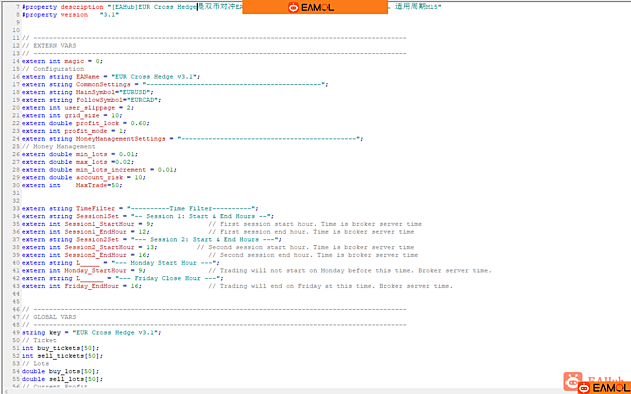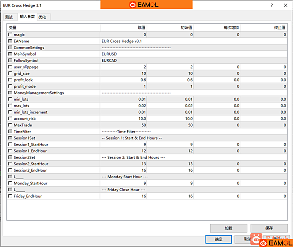 EUR Cross Hedge EA的主货币对是EURUSD,其实很多对冲EA的主货币对都是EURUSD。选用EURUSD作为主货币,我猜测是因为,EURUSD交易量大,相对稳定的原因。相关货币对是EURCAD,换成其他品种应该也可以,大家可以尝试一下。