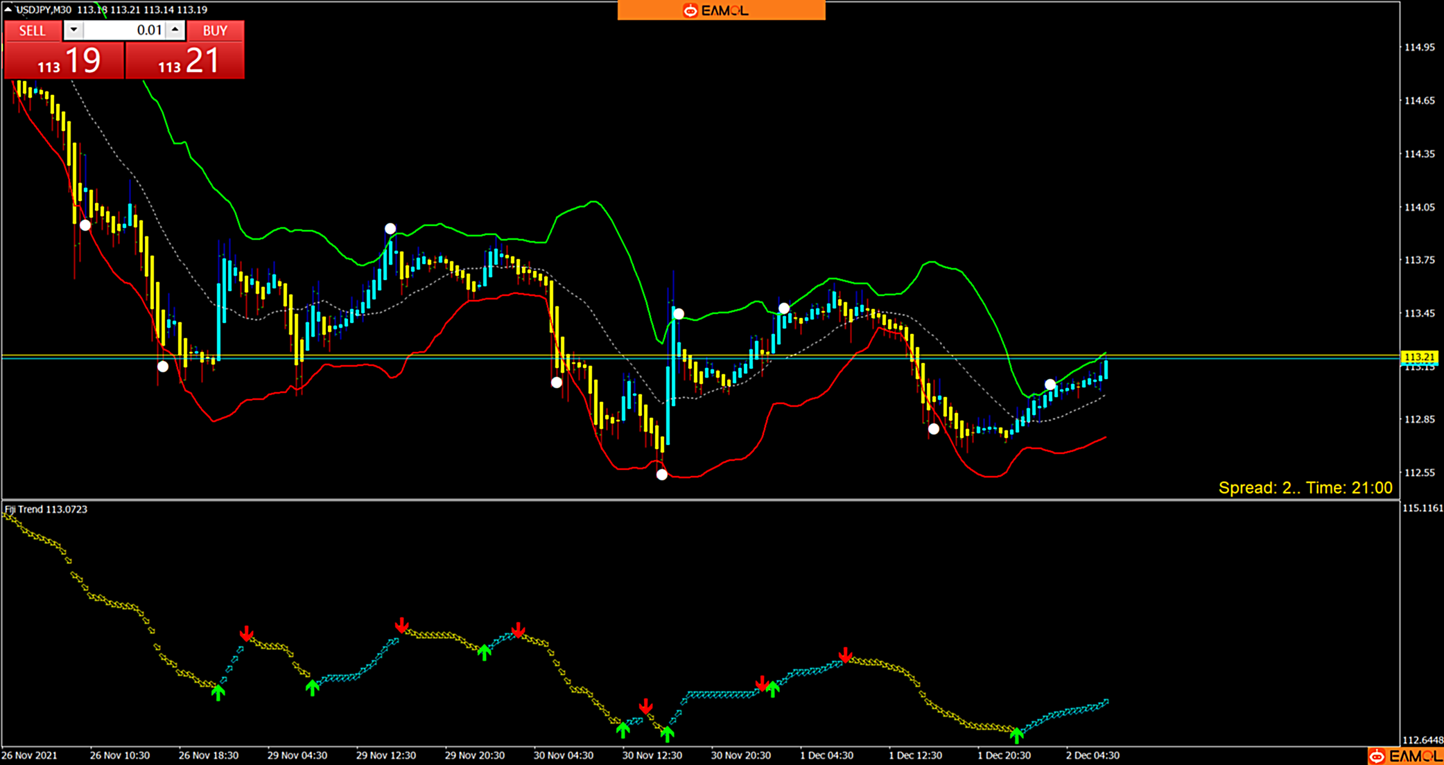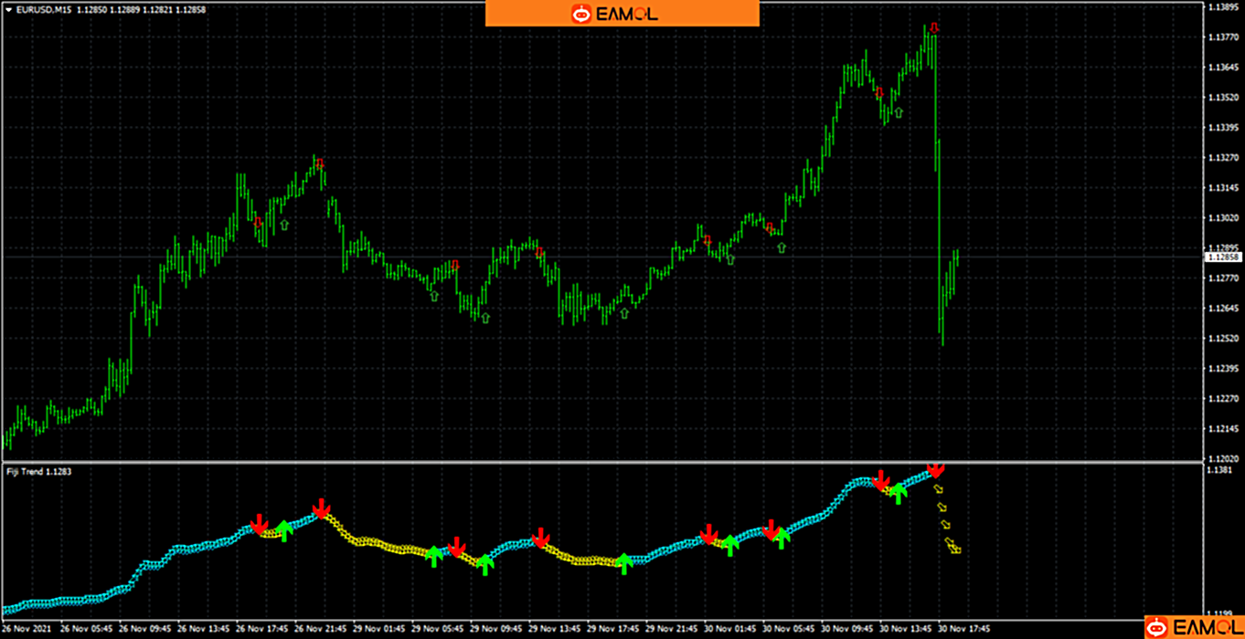 Fiji 是一款可靠的趋势指标,基于MA和ATR之间的交叉,根据交叉方向给出趋势信号。