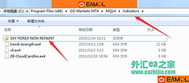 压缩包中有个装指标的文件夹,SKY FOREX NON REPAINT,把这个文件夹直接拖到indicator目录下,这样指标才会显示,否则不显示。