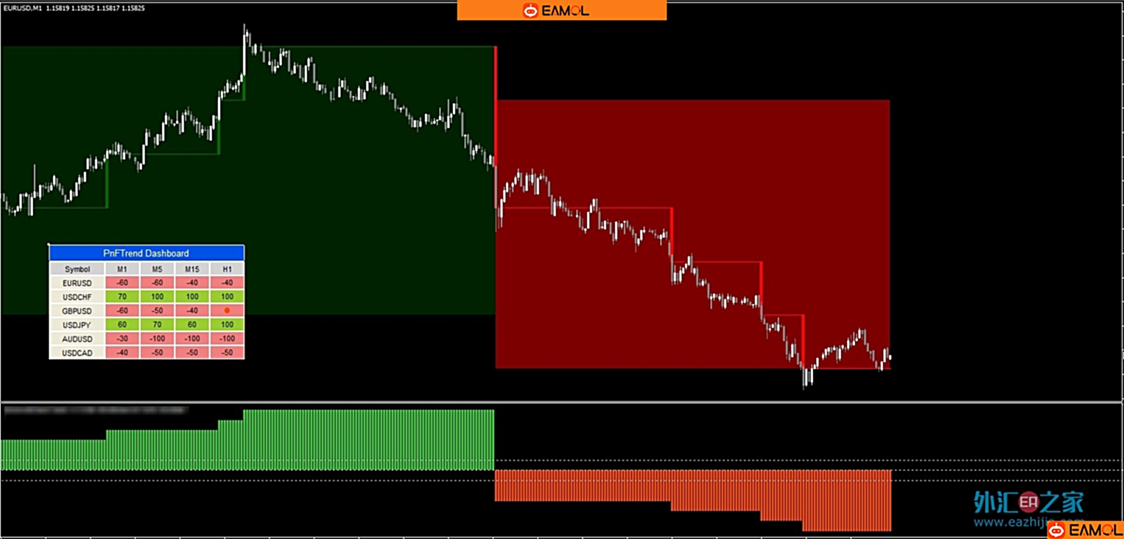 系统一共有4个指标,能够适用于各个时间周期,另外还有一个趋势探测面板,PnFTrend Dashboard_v1.0 600+时间周期:M1;M5; M15, M30,H1做多规则:1、主图是绿色区域2、Point and Figure Chart显示为绿色柱子