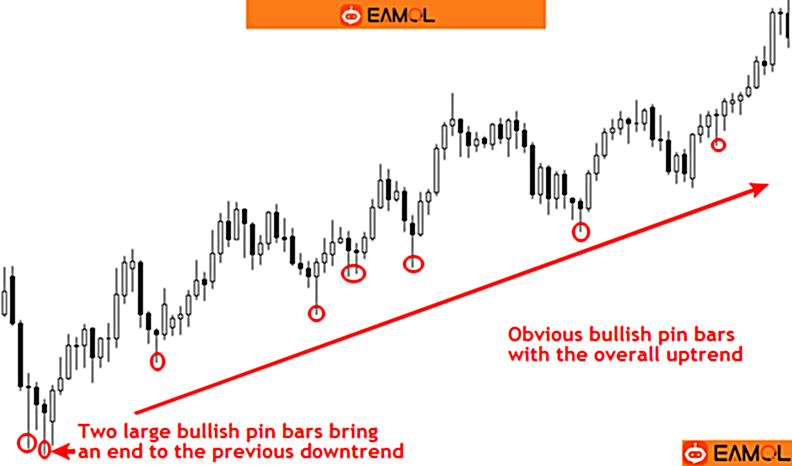 (图文注解:左:两个看涨pin bar暗示前期下跌趋势完成;右:那些明显的看涨pin bar始终贯穿整个上涨趋势。)