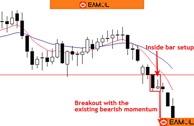 (图文注解:上:Inside bar形态;下:在强劲的下跌动能中推动价格向下突破。)