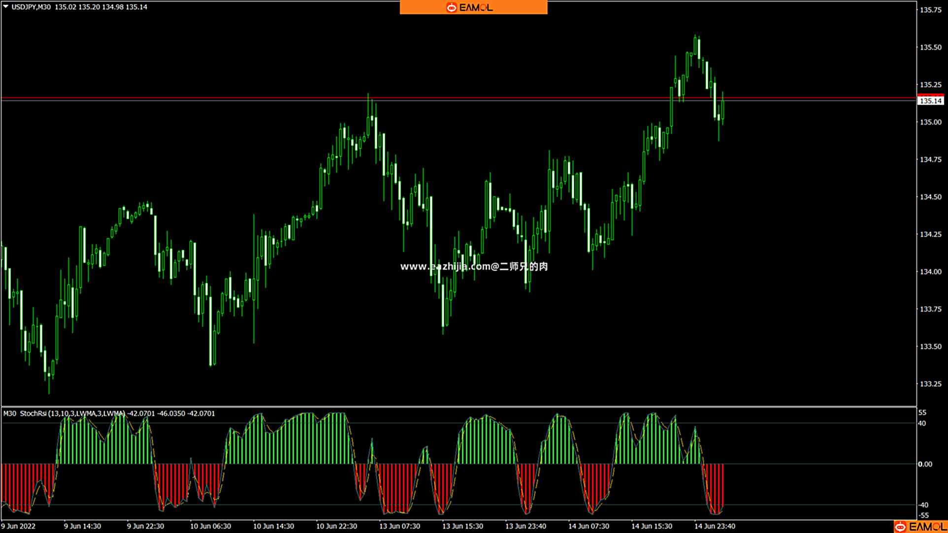 随机RSI指标(Stoch RSI)本质上是一个指标的指标。在技术分析中,为RSI指标提供了随机计算。这意味着它是在用户定义的一段时间内以其自身的高/低范围衡量RSI。随机RSI是一个震荡指标,该指标主要用于识别超买和超卖情况。