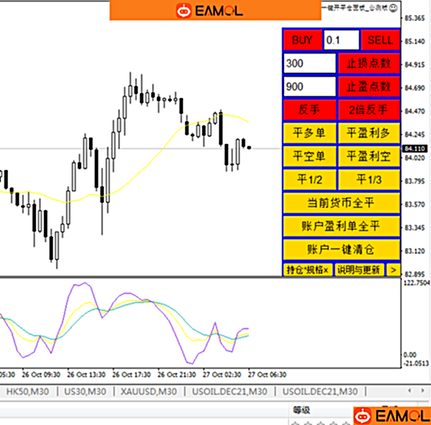 面板内置的移动止损、平均止盈、总体盈亏清仓及手机端mt4协助一键清仓功能,在EA属性框设置相关输入参数即可执行。
