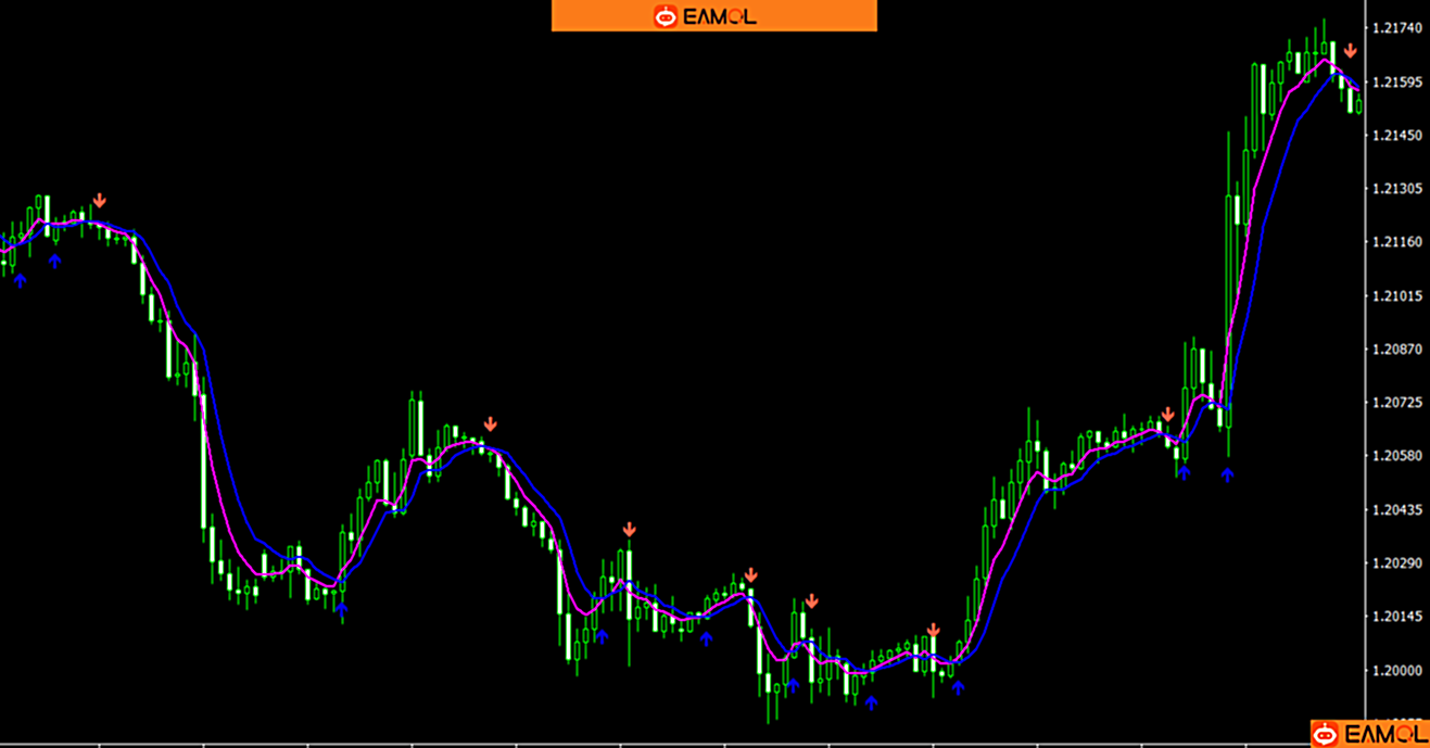 这个进场信号指标基于两条自适应的移动均线,均线类型设置:0 = SMA,1 = EMA,2 = SMMA,3 = LWMA.价格设置:0 = Close,1 = Open,2 = High,3 = Low,4 = HL / 2,5 = HLC / 3,6 = HLCC / 4.