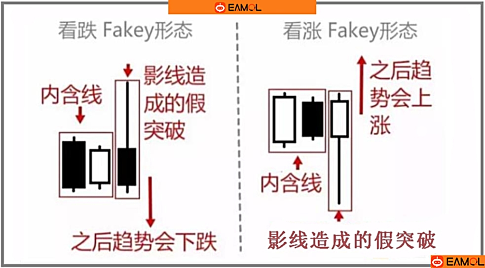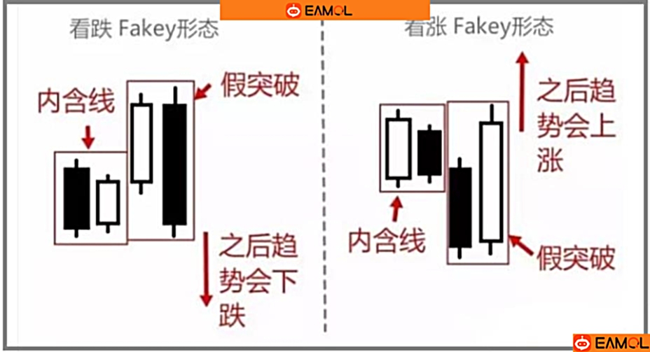Fakey形态。它是伴随着“内含线”形态出现的,而它的出现往往会带来“假突破”现象,并预示着趋势的逆转。