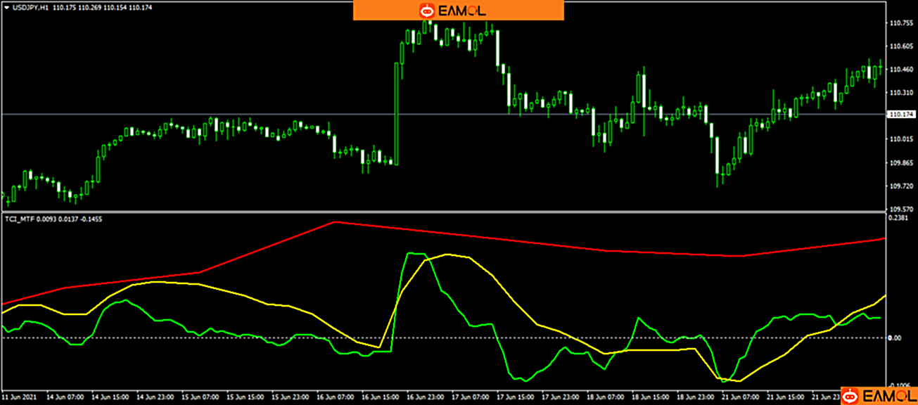 TCI(Trend Confirmation Indicator)趋势确认指标,基于3个不同周期的均线(均线类型可选择)。