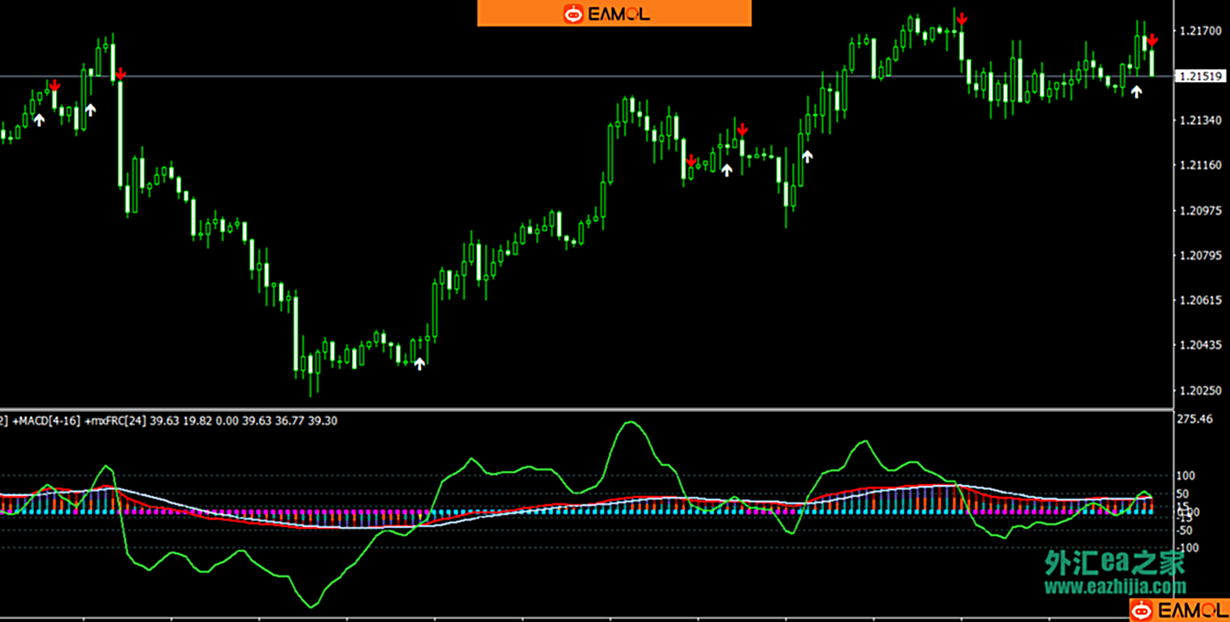 这款指标是俄罗斯大神Tankk的作品,属于StochasticX8系列指标。指标属于振荡指标,在图表上显示进场箭头。指标更适合在趋势行情中使用,如果是震荡行情,错误信号就有点多了。