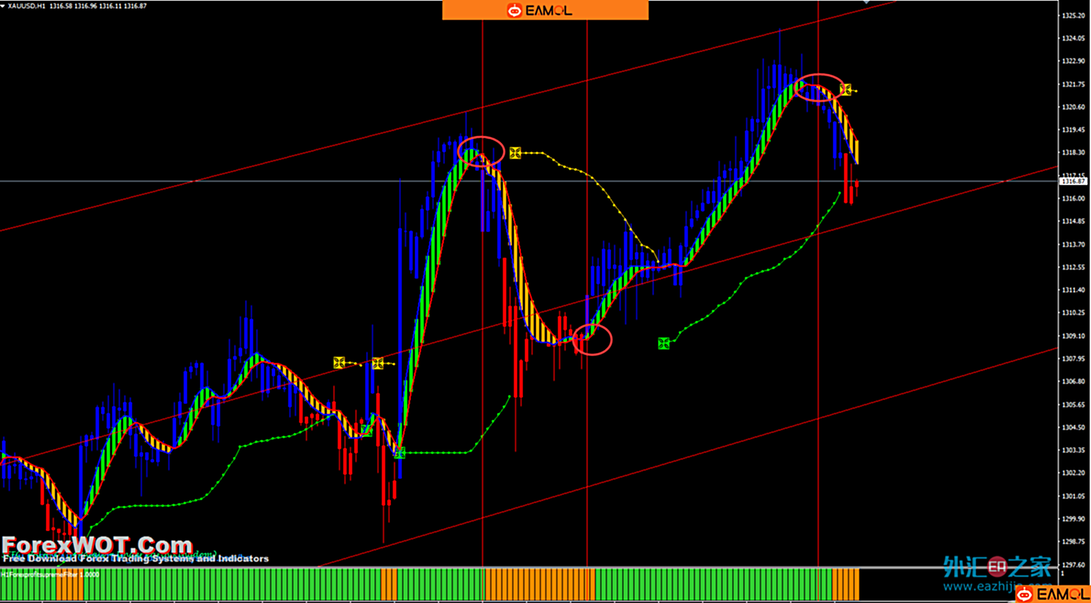 个人收集的一套指标组合,感觉比较好用,主要用在1H级别,无未来函数