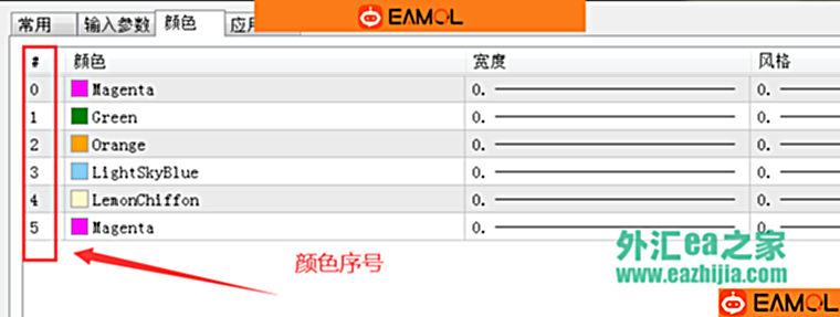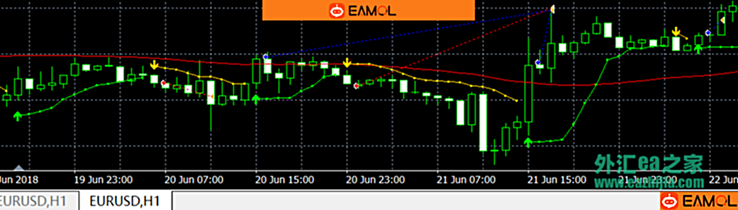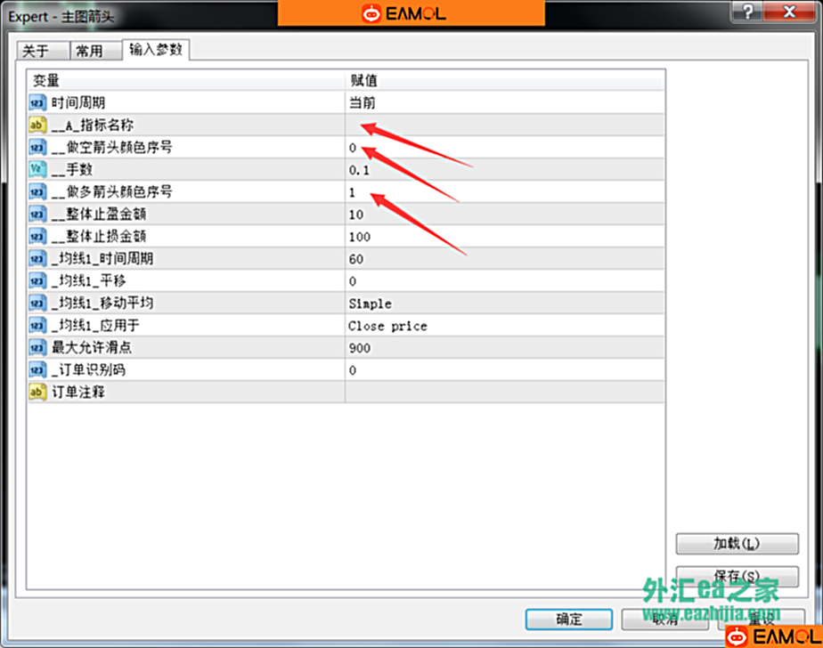 用户在加载ea时,需要双击下面第2张图中的红圈位置,输入自己的自定义指标的名称和颜色序号,ea才会建仓。 提示:有些自定义指标存在漂移现象,K线收盘后的图形仍然会改变,从而造成ea建仓位置不正确的假象,此类指标不适合做ea本ea以均线为趋势,出现向上箭头,并且收盘价在均线之上,建仓多单;出现向下箭头,并且收盘价在均线之下,建仓空单。效果如下图: