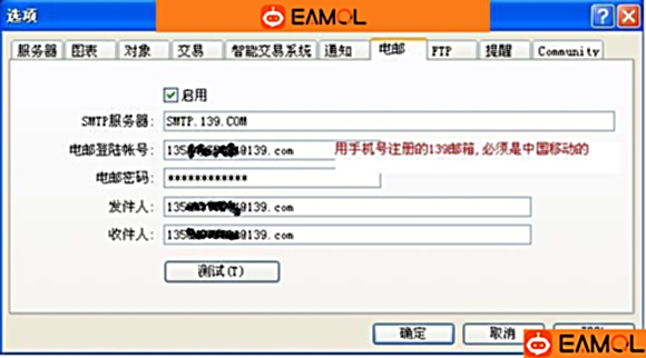 货币对那么多,人的精力有限,为了方便盯盘,自己写了一个可以关注多个货币对的小程式,策略比较简单,具体介绍写在源码里.需要扩展有朋友可以自己加进去。发送到手机的功能,还需要注册一个139邮箱。MT4再设置一下,按如下的设置就OK啦。